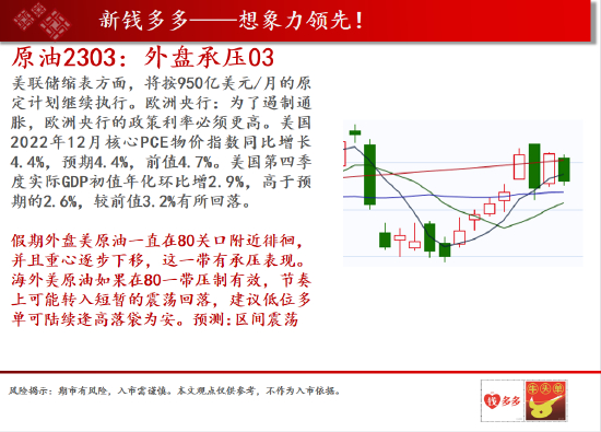基本面概述:美联储缩表方面,将按950亿美元/月的原定计划继续执行。欧洲央行:为了遏制通胀,欧洲央行的政策利率必须更高。美国2022年12月核心PCE物价指数同比增长4.4%,预期4.4%,前值4.7%。美国第四季度实际GDP初值年化环比增2.9%,高于预期的2.6%,较前值3.2%有所回落。