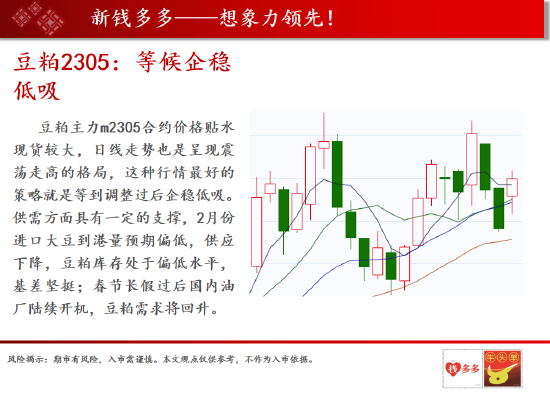 操作建议:豆粕主力m2305合约价格贴水现货较大,日线走势也是呈现震荡走高的格局,这种行情最好的策略就是等到调整过后企稳低吸。