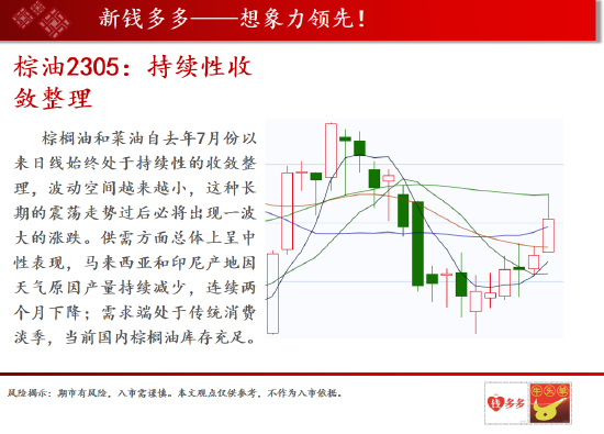 操作建议:棕榈油和菜油自去年7月份以来日线始终处于持续性的收敛整理,波动空间越来越小,这种长期的震荡走势过后必将出现一波大的涨跌。