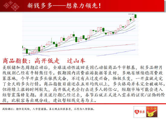 操作建议:美联储加息周期启动后,全球流动性流回美国已动摇商品牛市根基,较多品种月线级别已经有牛转熊信号。假期国内消费旅游数据等良好,多地有继续稳消费政策落地,今早开盘多头依然亢奋,不过有点过度兴奋,物极生变,一开盘就走完了全天的多头行情。商品指数目前还在五日均线以上,多头格局并未完全被破坏。但持续上涨的时间较久,高开低走也会打击追多人的信心,短期市场可能会进入短暂震荡修复期。并且流行期已经过去,春节后就正式进入需求的证实/证伪的阶段,比较容易出现分歧,建议暂短线交易为主。