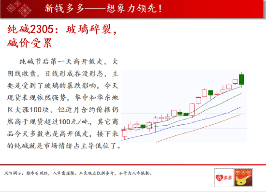 操作建议:纯碱节后第一天高开低走,大阴线收盘,日线形成吞没形态,主要是受到了玻璃的暴跌影响。