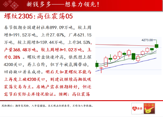 操作建议:明后天如果螺纹不能马上再度上破4200关口,则建议继续高抛低吸震荡交易为主。房地产需求预期转好,但还需节后实际去库情况验证。预测:高位震荡。