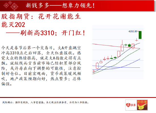 操作建议:今天是春节后第一个交易日,大A开盘跳空冲高3310点之后回落,全天红盘报收。感觉大众的热情很高,就是大A指数走得有点飘。就短线而言当前市场已经积累部分风险,或许存在向下调整的可能性,注意控制好仓位。目前宏观面,货币政策暖风频吹,地产政策预期向好,热点繁多;总体偏强。