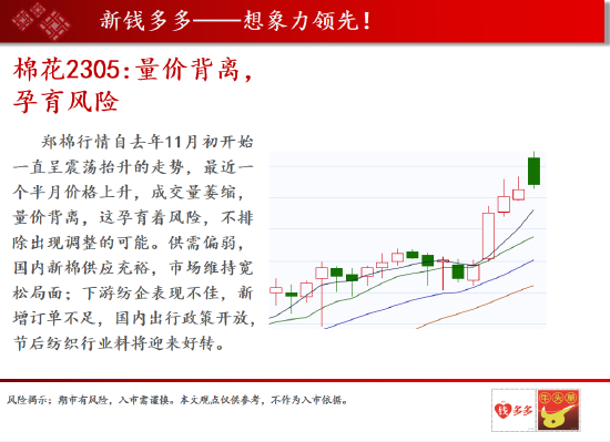 操作建议:郑棉行情自去年11月初开始一直呈震荡抬升的走势,最近一个半月价格上升,成交量萎缩,量价背离,这孕育着风险,不排除出现调整的可能。