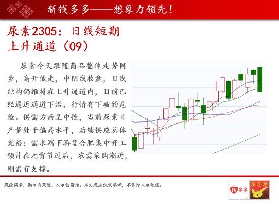 操作建议:尿素今天跟随商品整体走势同步,高开低走,中阴线收盘,日线结构仍维持在上升通道内,目前已经逼近通道下沿,行情有下破的危险。