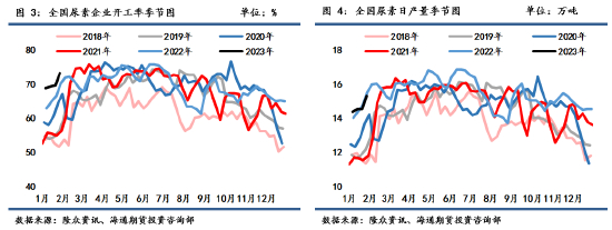 由于2022年冬季煤头和气头尿素限产均远不及往年,因此从2023年伊始,尿素企业开工率便高位历史同期,数据显示1月6日全国尿素企业开工率为68.92%,这是近五年新年第一周开工率的最高点,其中煤头尿素企业开工率为77.79%远高于往年同期。1月份受部分贸易商春节前备货的影响,尿素企业订单充裕,出货良好,促使企业生产积极性较高,尿素日产量持续提升,数据显示,截至1月27日,全国尿素企业开工率为73.24%,月环比上涨8.2%,全国尿素日产量为15.31万吨,月环比上涨0.79万吨。从数据来看,1月份全国尿素日产量在14.4-15.8万吨,平均产量在15万吨,预计月度产量达到466万吨左右,高于去年同期。2月份春耕备肥逐渐启动,现货市场成交尚可,在需求促使下日产量难以大幅下跌,因此短期尿素开工率就行保持高位。