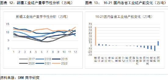 川滇地区供给季节性特征明显,新疆地区凭借资源和电力优势产能提速独一份。从季节性图看,川滇地区具有明显的5-10月产量高,剩余月份产量低的特点。这样的差异主要是由于当地生产对水电依赖度较高,而水电又受到丰枯水期的影响。据百川盈孚数据,22年10月,云南工业硅用水电比例为88.6%,四川工业硅用水电比例为74.4%,相较之下西北水电应用极少,其中新疆工业硅用水电比例只有4%。因此,川滇地区工业硅企业在枯水期开工率仅20%-30%,但到了丰水期开工率可以回升到70%左右甚至更高。相比之下,新疆地区的工业硅生产在不受疫情等不确定因素干扰的情况下更为稳定。此外,新疆工业硅还具备价值生产成本方面优势,成为近几年国内产能增量最大的地区。据SMM数据,16-21年新疆工业硅产能增加了61.3万吨,当地产能从与云南平分秋色迅速发展成独领风骚。