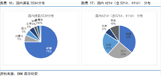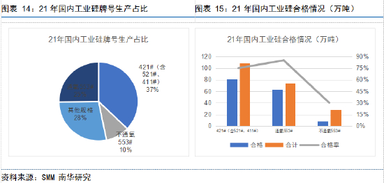 国内工业硅牌号众多,不过只有品质符合国标Si5530要求及更高品质的工业硅可以作为交割品。从国内牌号的产量占比看,21年国内553#及以上工业硅约占总量的70%以上,市场交割品来源充足,可以满足绝大多数产业客户参与工业硅期货市场交易和交割的需求。其中,553#工业硅有通氧与不通氧之分,通氧的目的是去除Ca杂质,不通氧553#虽理论上也可以满足交割标准,但实际上存在合格率太低的问题。据SMM统计,21年不通氧553#的合格率仅约30%,通氧553#和421#(含521#、411#)的合格率则基本可以达到75%以上。此外,符合交割标准的常见牌号也在地区分布上具有不同特征。通氧553#主要集中在新疆,而421#(含521#、411#)则几乎是新疆、四川、云南三分天下。因此当421#现货对期货升水大于2000元/吨时(选择交割421#的经济性不高),新疆地区满足交割要求的工业硅供给临近交割期是否充足便需要格外关注。