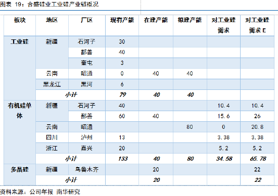 作为国内工业硅第一龙头,合盛硅业的产能规划以及产业链布局备受瞩目。其中,工业硅环节未来增量集中在云南昭通,但是由于水电的局限性,为其产能投产的时间节点和体量都增加了许多不确定性。从合盛当前的规划来看,假设集团自身生产的工业硅在满足全部下游板块需求后才会外销,目前合盛的理论对外供应量为44万吨,未来有望达到71万吨。