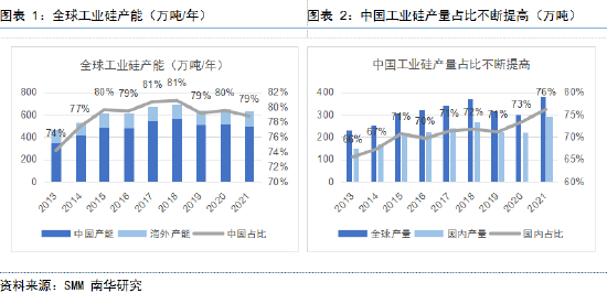 我国是全球最大的工业硅生产国,近年来工业硅产量全球占比不断提高。据SMM数据,2021年全球工业硅产能632万吨,其中中国工业硅产能为498万吨,约占全球总量的79%,是当之无愧的全球第一大工业硅生产国。在2013年-2018年期间,中国工业硅产能经历了高速增长和高位回落两个阶段,也主导了全球工业硅产能的变化。2018年前,在利润刺激下我国工业硅产能规模不断扩张;而2018年后因环保政策等原因,新增产能审批趋严,我国工业硅产能停止增长,甚至由于个别落后、违规产能的出清,出现一定规模的产能收缩。当前在政策不断规范下,我国工业硅市场已从无序竞争过渡到有序增长,产量全球占比逐年提高,工业硅中国制造的影响力不断扩大。据SMM数据,截至2021年,全球工业硅产量在经历了2018以来的调整后再度增长至382万吨(同比增长27%),其中中国产量为291万吨(同比增长32%),占比达到76%,中国增速领跑全球。