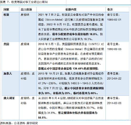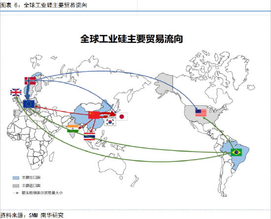中国虽是全球最大的工业硅出口国,但是由于双反问题,向欧美国家的出口路径受阻,大多去往亚洲地区,这也使得工业硅的全球贸易存在一定的“割裂”现象。自上世纪80年代末起,中国工业硅出口就开始受到来自欧盟的反倾销立案调查,在长达30余年的时间里,美国、加拿大、澳大利亚等国也相继对中国做出了倾销及补贴的裁定,并对中国出口的工业硅加征了高额的惩罚性税额。因此,中国工业硅主要出口至日韩、东南亚、中东等地,欧盟、英国、美国等市场进口的工业硅则主要来自挪威、巴西等。而随着欧美对于下游终端光伏装机的需求突飞猛进,对华的双反政策会否出现松动可能,以及美国是否会巧借“新疆”问题拉动其盟友(尤其是日韩)进一步围剿新疆制造,都将成为影响我国工业硅出口的政策端不确定因素。