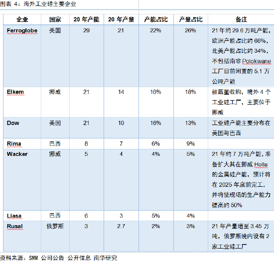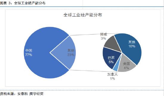 相较而言,海外工业硅发展早、行业成熟度高,近年来生产规模稳定,行业集中度高。据安泰科统计,全球工业硅产能约有23%分布在海外,其中巴西占其中5%、北美占其中4%,挪威占其中3%。这些产能又主要集中在Ferroglobe、Elkem、Dow等大型企业旗下,CR3达到50%以上。由于海外产能相对稳定,未来几年几无大型项目投产计划,因此当前影响全球范围内工业硅供给主要边际增量仍在国内,对于国外产能则更须警惕诸如电力紧缺(或成本过高)、工人罢工等因素带来的减停产风险。