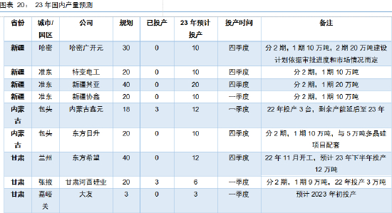 随着政策指引的进一步合理化,工业硅从高耗能产业被重新定义为高载能行业,叠加下游需求的带动,工业硅产业再一次进入了增长期,预计23年将有约150万吨/年的新增产能投放。从地里角度看,大多集中在西北地区,而从时间角度看,下半年投产项目居多。这些产能的投产进度,将关系到23年上半年上游工业硅供给和下游多晶硅需求的错配程度,以及供需错配的持续时间。而下游多晶硅的具体需求,我们将在下一篇需求专题中为大家详细介绍。