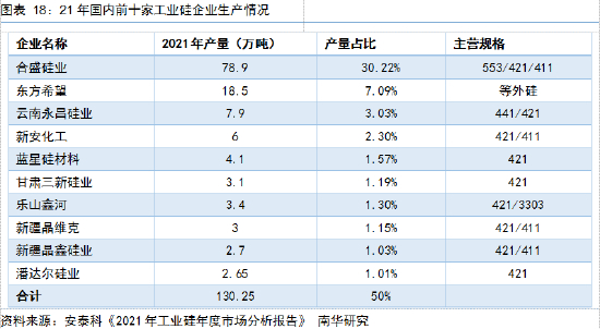 近年来,国内工业硅供给还呈现出集中度不断提高的特征。国内约有210多家工业硅企业,但据安泰科《2021年工业硅年度市场分析报告》显示,仅前10家龙头企业就贡献了市场约50%产量,这一数字在16年才39%。其中,合盛硅业更是一家独大,21年其在国内的产量占比达到30%以上,在前10企业内部的占比也从16年的43%增长到21年的61%。不论是全国范围内,还是龙头企业内部,“头部化”现象都在不断增强。