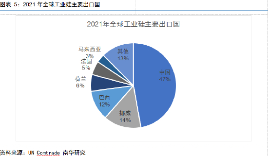 从贸易流向看,中国、巴西、挪威等国既是工业硅的主要生产国,也是工业硅的主要出口国,为全球工业硅的使用源源不断输送血液。据SMM数据,2021年中国工业硅(包含97硅和再生硅)产量占全球78%,其次是巴西(7%)、挪威(6%)、美国(3%)、法国(3%)等。而从UN Comtrade统计口径看,2021年全球共上报164.4万吨工业硅出口量,其中47%来自中国,14%来自挪威,12%来自巴西,其余27%来自其他国家和地区,这些工业硅主要流向了欧、美、日、韩、印、泰等国家和地区。