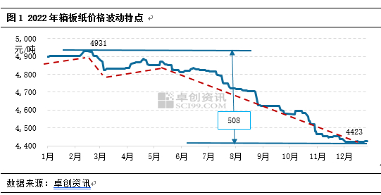 如图1所示,2022年箱板纸最高价4931元/吨,出现在2月中旬,最低价4423元/吨,出现在12月下旬,价格最大波动幅度508元/吨。高低波幅较2021年有所收窄,波幅在11.49%。据卓创资讯数据监测, 2022年中国箱板纸市场均价为4725元/吨,较2021年均价下跌97元/吨,同比跌幅2.01%。截止到12月30日,中国箱板纸产品基准价格为4425元/吨,较去年末下调472元/吨。