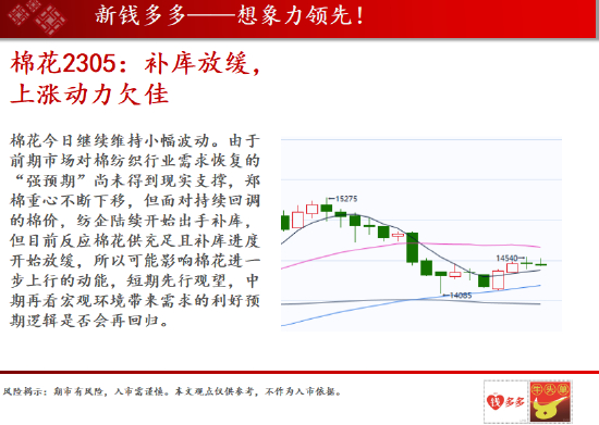 操作建议:但目前反应棉花供充足且补库进度开始放缓,所以可能影响棉花进一步上行的动能,短期先行观望,中期再看宏观环境带来需求的利好预期逻辑是否会再回归。