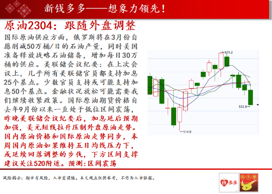 操作建议:昨晚美联储会议纪要后,加息延后预期加强,美元短线拉升压制外盘原油走势。国内原油价格和国际原油走势同步,本周国内原油如果维持五日均线压力下,或延续回落调整的步伐,下方区间支撑建议关注520附近。预测:区间震荡