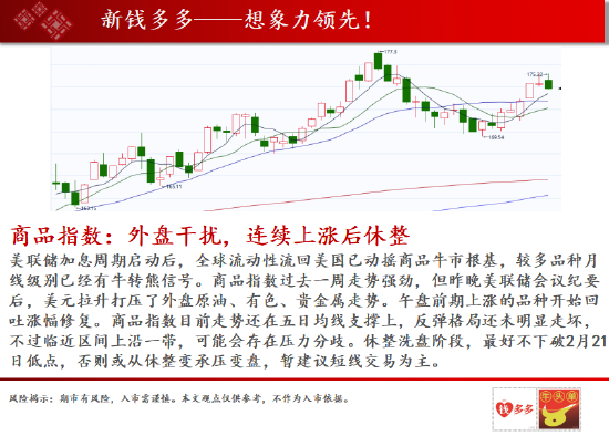 操作建议:美联储加息周期启动后,全球流动性流回美国已动摇商品牛市根基,较多品种月线级别已经有牛转熊信号。商品指数过去一周走势强劲,但昨晚美联储会议纪要后,美元拉升打压了外盘原油、有色、贵金属走势。午盘前期上涨的品种开始回吐涨幅修复。商品指数目前走势还在五日均线支撑上,反弹格局还未明显走坏,不过临近区间上沿一带,可能会存在压力分歧。休整洗盘阶段,最好不下破2月21日低点,否则或从休整变承压变盘,暂建议短线交易为主。