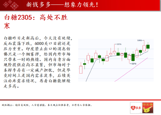 操作建议:国内自身方面现阶段供应尚不显紧,但市场对于本榨季存有一定减产担忧,但是毕竟时间上是国内需求淡季,后续关注补库需求情况,再看白糖能继续走多高。