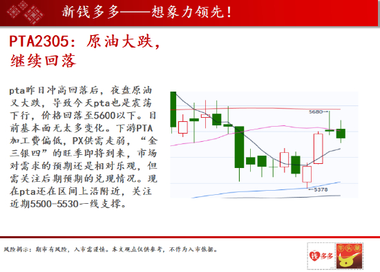 基本面概述:pta昨日冲高回落后,夜盘原油又大跌,导致今天pta也是震荡下行,价格回落至5600以下。目前基本面无太多变化。下游PTA加工费偏低,PX供需走弱,“金三银四”的旺季即将到来,市场对需求的预期还是相对乐观,但需关注后期预期的兑现情况。