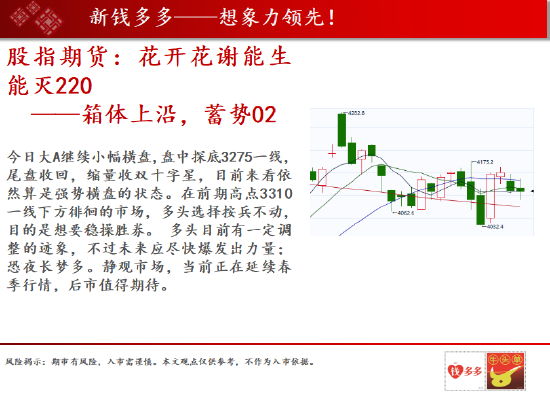 操作建议:今日大A继续小幅横盘,盘中探底3275一线,尾盘收回,缩量收双十字星,目前来看依然算是强势横盘的状态。在前期高点3310一线下方徘徊的市场,多头选择按兵不动,目的是想要稳操胜券。 多头目前有一定调整的迹象,不过未来应尽快爆发出力量;恐夜长梦多。静观市场,当前正在延续春季行情,后市值得期待。