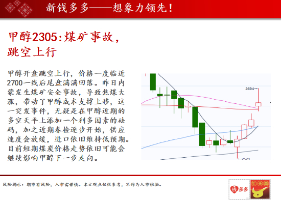 基本面概述:甲醇开盘跳空上行,价格一度临近2700一线后尾盘满满回落。昨日内蒙发生煤矿安全事故,导致焦煤大涨,带动了甲醇成本支撑上移,这一突发事件,无疑是在甲醇近期的多空天平上添加一个利多因素的砝码,加之近期春检逐步开始,供应速度会放缓,进口依旧维持低预期。