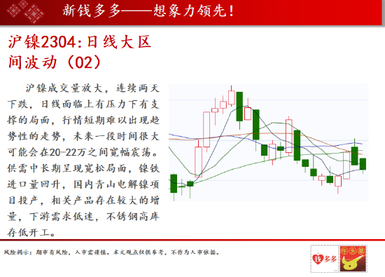 操作建议:沪镍成交量放大,连续两天下跌,日线面临上有压力下有支撑的局面,行情短期难以出现趋势性的走势,未来一段时间很大可能会在20-22万之间宽幅震荡。