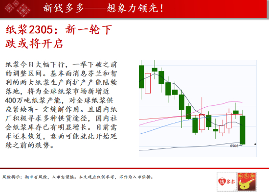 基本面概述:纸浆今日大幅下行,一举下破之前的调整区间。基本面消息芬兰和智利的两大纸浆生产商扩产产能陆续落地,将为全球纸浆市场新增近400万吨纸浆产能,对全球纸浆供应紧缺有一定缓解作用。