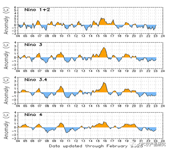 Nino3.4指数(西经170度-西经120度、北纬5度-南纬5度)通常使用5个月的平均值,厄尔尼诺/拉尼娜事件定义指尼诺3.4指数海温超过+/-0.4℃六个月或更长时间。从NOAA最新发布的Nino3.4数据来看,拉尼娜预计将逐步消失,厄尔尼诺可能随之到来。2023年7月至2024年6月厄尔尼诺发生的威胁仍在。