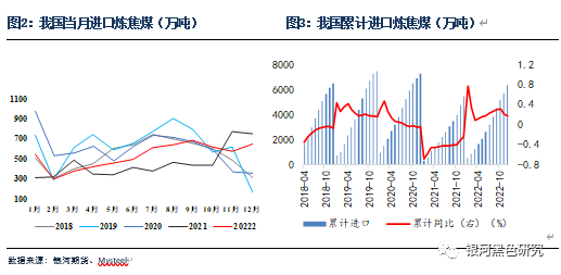 我国进口炼焦煤总量方面看,据海关总署最新数据显示,2022年12月份,中国进口炼焦煤646.49万吨,占煤炭总进口量的20.92%,环比增加12.78%,同比减少13.66%。2022年全年中国累计进口炼焦煤6383.84万吨,同比增长16.71%。