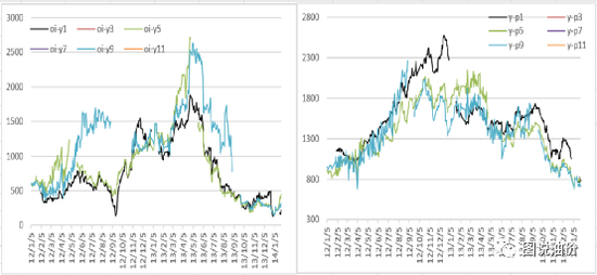 一直以来,我们所认知的就是菜油一般比豆油高出600点左右,而豆油又比棕榈油高出600点左右。2012年到2013年是改变交易油脂类期货人士认知的一年。12年底,豆油比棕油高了2000点以上,而13年二季度,菜油也比豆油高出了2500点。一批专门做三种油脂套利的资金吃了大亏。棕油是因为当年库存高启,且1月低温需求欠佳,导致价格受压。而菜油是因为当年菜籽减产预期的炒作。各品种的内在基本面的因素使得油脂间的联动效应出现了分化,并愈演愈烈。而套利交易者妄图纠正这个价差的操作方式给予了单向交易者更多的对手仓位,所以使得行情演变的烈度更大,强者更强,弱者更弱。