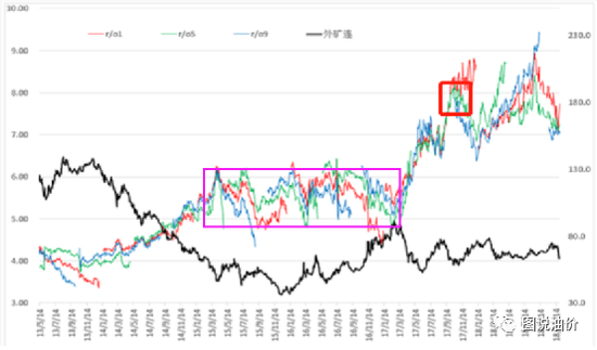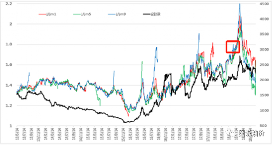 另一个品种是焦炭焦煤比。当然也有交易焦煤焦炭价差的。在供给侧改革以后,焦炭的价格就插上了翅膀一样,焦炭焦煤比价从正常的1.4直飞1.8.