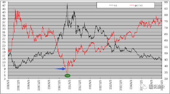 2011年还有一个犯错的品种,在原油价差止损后,我马上又盯上了一个正在历史下边缘运动的品种—金银比。当时,白银正在全球投资者的追捧中上涨,后面有着多家大型投资机构在呼风唤雨,金银比已经来到了40,这已经是一个非常有价值的位置。从1983年以来,只有1997年以及2006年,金银比来到过40-45的历史低位。经过讨论我们在40位置买进了30个组合(红色箭头)。