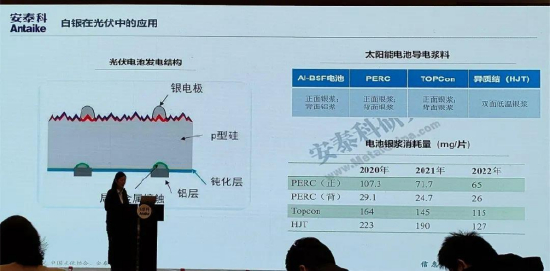 中国光伏用银从2012年700t左右仅为电气的一半,快速增加,2022年已经达到3000t左右,成为第一大工业用银领域。银浆是除了硅以外,电池片中最大的成本,电池片企业持续追求单位耗银量的下降。2022年,电池银耗继续降低,其中PERC 91mg/片(-5.4mg/片)、Topcon 115mg/片(-30 mg/片)、HJT 127mg/片(-63 mg/片)。