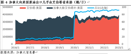 作为原油产量世界前五的加拿大,约有80%的贡献来自艾伯塔省。而从2020年之后加拿大向美国原油的出口基本上都是通过艾伯塔省进行出口的,甚至可以说艾伯塔省对美国的出口就可以代表加拿大对美国的出口。