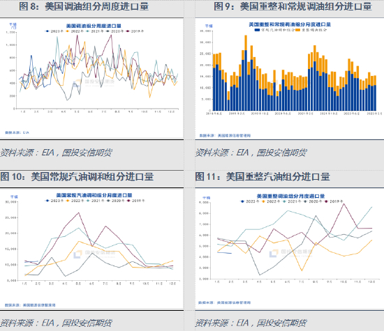 美国进口高辛烷值汽油调和组分主要划分为重整调油组分和常规调油组分,其中常规调油组分是去掉重整汽油、乙醇、烷基化物等组分外的,以甲苯、二甲苯等各种芳烃产品为主;常规调油组分的进口量大约是重整汽油的2倍。整体看,美国高辛烷值调油组分的进口呈现中间高两头低的走势,与美国夏季汽油对高辛烷值、低蒸气压的调油组分需求一致。其中,重整调油组分的进口季节性表现不明显,调油组分进口量的季节性波动主要来自常规汽油调和组分。
