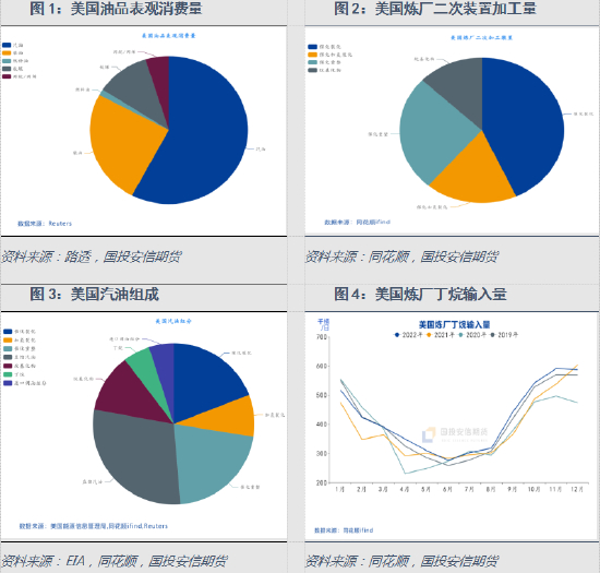 根据美国汽油产量、炼厂二次装置的加工量及进口调油组分和炼厂丁烷输入量等数据,倒推出美国直馏汽油产量后,得到美国汽油的成分来源。美国催化裂化加工量占比40%以上,催化重整占比约24%,催化加氢裂化约10%,还有大量的直馏汽油。以上不同工艺产生的汽油大多不能直接用作汽油发动机,而是要进行调和达到相应的标准后成为汽油商品。在调和的过程中需要兼顾各项指标,最主要的是加入高辛烷值组分,且在冬季和夏季有较大的区别。整体看,受汽油的RVP限制,冬季调油可以加入丁烷,但夏季调油要大幅降低偏轻的丁烷的使用,增加芳烃类的掺混比例。