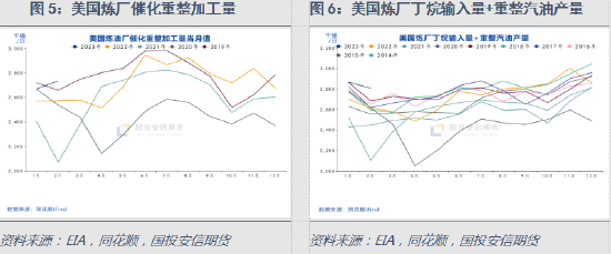 从美国炼厂的重整加工量来看,呈现“中间高、两头低”的季节性特点,与丁烷的季节性走势正好相反。将美国炼厂的丁烷的输入量和重整装置加工量相加后得到的总量曲线,季节性特点被抹平。