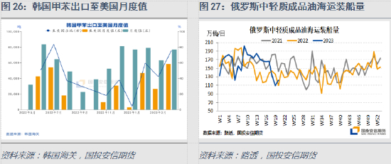 经过了近一年的调整之后,全球油品的物流重构基本结束,今年2月份之后西方国家对俄罗斯成品油的制裁落地。从俄罗斯中轻质成品油的船期数据看,出口只在制裁生效后出现短暂的下滑,之后快速恢复,整体看3月的装船量没有受到影响,5月份以来装船量的下降可能与俄罗斯炼厂检修及海外需求偏弱有关,没有对全球油品市场带来明显波动。整体看,主导2022年夏季汽油行情及芳烃调油需求的因素在今年表现得较为缓和,尤其是经过了去年夏季的极端行情之后,调油商已经在夏季调油季到来之前提前做准备,从韩国至美国的芳烃出口可见一斑。
