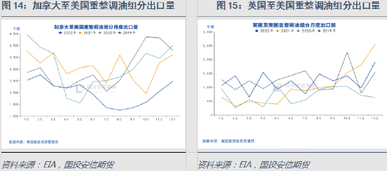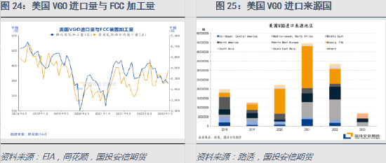 俄罗斯是美国重要的VGO进口来源国。从路透船期数据看,2020年俄罗斯VGO占美国市场的近6成,2021年中东、北美、加勒比海和中美洲地区及西欧对美国的出口均有增加,导致俄罗斯的占比VGO降至4成附近。2022年3月之后,因美国对俄罗斯能源的制裁,其来自俄罗斯的VGO中断,来自中东和北美地区的增量明显。从2023年的数据看,1-2月美国的VGO海外进口量同比去年大幅增长,主要来自沙特、印度、英国和智利。