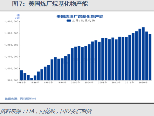 21世纪初的几年中,由于MTBE在国外被禁用,北美很多MTBE生产商在原有装置上通过改造引入这种技术来生产异辛烷。美国的烷基化油自20世纪80年代以来呈现持续增长的势头,2008年达到126万桶/日后维持平稳,2016年至2020年持续增长,最高达到135万桶/日的高位,近两年有所回落,2022年降至130万桶/日以内。