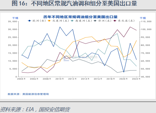 美国的常规调油组分最大的进口来源地是欧洲,2010年总量最高达到1亿桶,2011年后快速下降至7000万桶附近,于此同时从北美洲、东北亚的进口量在增加。