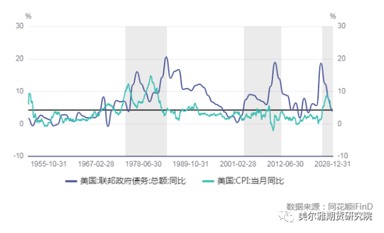 但是,这一次黄金价格并未下跌至同期水平,一直介于1800-2000美元/盎司区间波动,我们认为这其中背后深层次原因其实还是历史问题的遗留,美国政府天量的债务问题,令市场担忧美元信用,因此,各国央行纷纷选择买黄金抛售美元信用支撑的美债。美国经济历史上也面临过同样的困境,美国经济二战后面临巨量债务和经济结构转型的矛盾。1971年,布雷顿森林体系瓦解,美元与黄金脱钩,美国通胀高烧不退,黄金价格从60美元快速涨至600美元。当时美元体系遭遇信用危机的时候,美联储主席保罗沃尔克站出来,快速地加息,将名义利率加至高达20%,通过牺牲企业和经济,换来通胀快速回落至2%,随后美国才从这一困境中慢慢走出来。