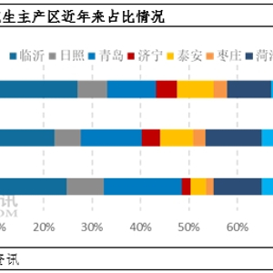 山东花生播种产区主要集中在临沂、青岛、烟台、日照、泰安、菏泽、潍坊、枣庄等地。近些年来逐渐由20年前的产量大省成为外调货源的消耗省份。从图1中可以看出,近年来,临沂地区总产量占到山东省的25%左右。青岛、烟台等传统米种植区域因可选经济作物较多以及农户外出打工行为增加等因素,在省内的花生面积占比呈下降走势,面积占比在10%-16%之间徘徊。其他几个产区如济宁、泰安、日照、威海等,整体占比相对分散。