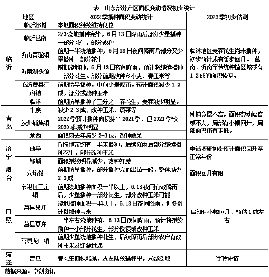 【导语】近年来山东产区地位逐年下降,2022季花生种植季因多地偏旱导致部分地区种植面积减少。新季来临,2023年5月17-19日,卓创资讯对山东部分重点产区种植情况进行摸排,具体内容详见正文。