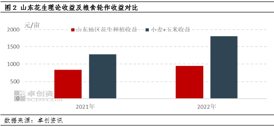正常年份下,山东地区单种一季花生理论收益在1000元/亩以内(主因山地偏多的情况下有人工成本投入,不过自有地农户一般不会将人工成本记入在内)。近两年随着粮食作物价格的提升,小麦+玉米轮作的收益相对理想,并且山东地区种植小麦以及玉米普遍有部分补贴,补贴金额共约150-180元/亩。同时粮食作物机械化率较高,管理方便。