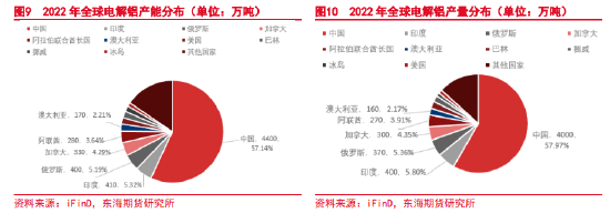 根据美国地质调查局的数据显示:2022年全球电解铝建成产能共计7700万吨,产量共计6900万吨,产量占比情况和产能基本一致。