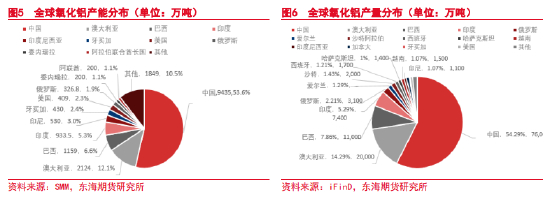 氧化铝的产能分布与铝土矿在各国家的资源禀赋存在明显的不同,从2022年的数据来看:中国铝土矿产量占全球的23.7%,但氧化铝产能却占到全球的53.6%,存在铝土矿的供给缺口;澳大利亚铝土矿产量占全球的26.3%,但氧化铝产能却只占到全球的12.1%,存在明显的氧化铝需求缺口;几内亚铝土矿产量占全球的22.6%,而国内仅有1家65万吨产能的氧化铝厂,存在巨大的氧化铝需求缺口——我国企业正在几内亚建立氧化铝厂。