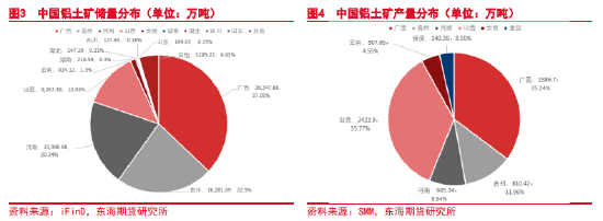 根据自然资源部公布的数据来看,2021年我国铝土矿储量约为7.1亿吨;其中,广西以2.6亿吨位居第一、占比37.1%,贵州以1.6亿吨位居第二、占比22.9%,河南以1.4亿吨位居第三、占比20.02%,山西以0.93亿吨位居第四、占比13%。可见,国内铝土矿资源集中度高,四省储量合计6.6亿吨,占全国储量的93.2%。